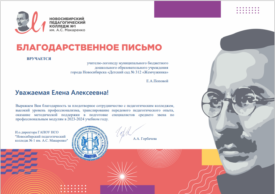 Новосибирский педагогический колледж №  1 им. А. С. Макаренко	Благодарственное письмо  за транслирование педагогического опыта