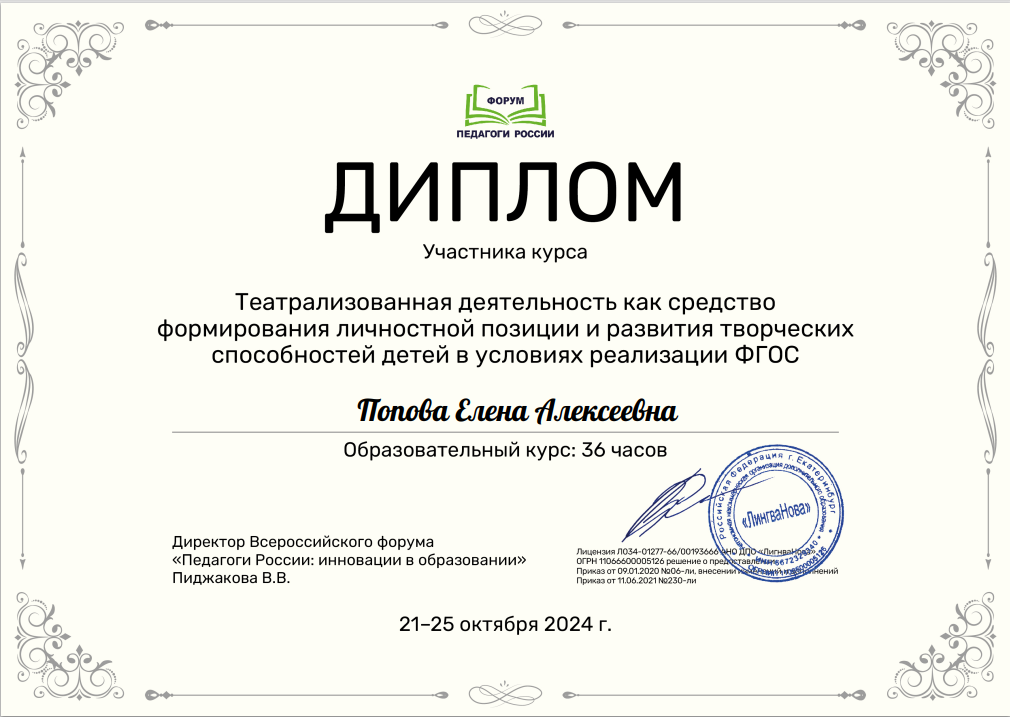 (36 часов)		Диплом участника курса «Театрализованная деятельность как средство формирования личностной позиции и развития творческих способностей детей в условиях реализации ФГОС»