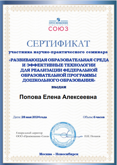 (6 часов)	Сертификат участника научно-практического семинара «Развивающая образовательная среда и эффективные технологии для реализации ФОП ДО»