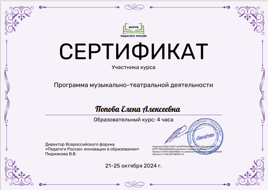 (4 часа)		Сертификат участника курса «Программа музыкально-театральной деятельности»