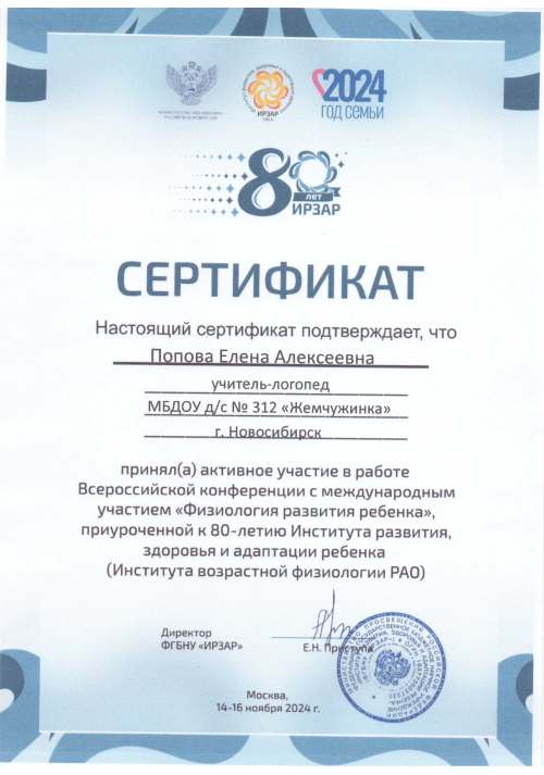 Сертификат участника в работе во Всероссийской конференции с международным участием «Физиология развития ребенка»