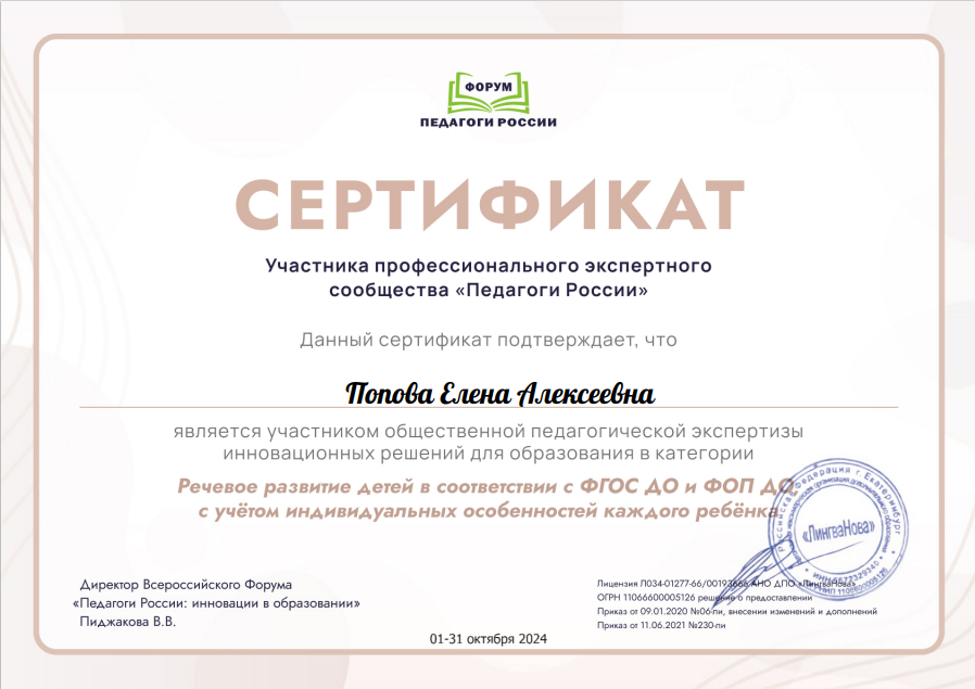 Всероссийский форум «Педагоги России: инновации в образовании»	Сертификат участника экспертного сообщества «Педагоги России» в категории «Речевое развитие детей в соответствии с ФГОС ДО и ФОП ДО с учетом индивидуальных особенностей каждого ребенка»