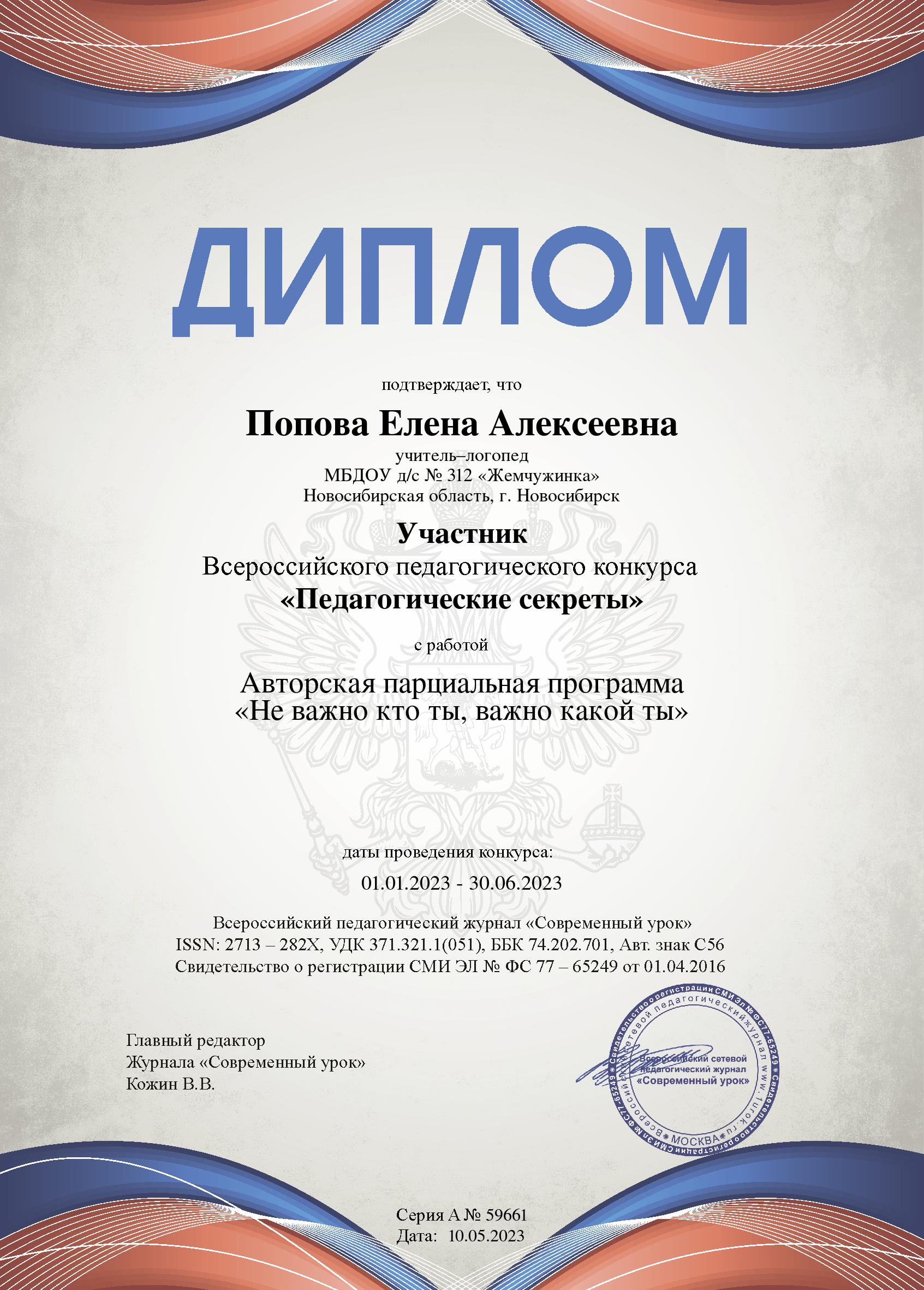 Всероссийский педагогический журнал «Современный урок»	Диплом участника Всероссийского педагогического конкурса «Педагогические секреты»