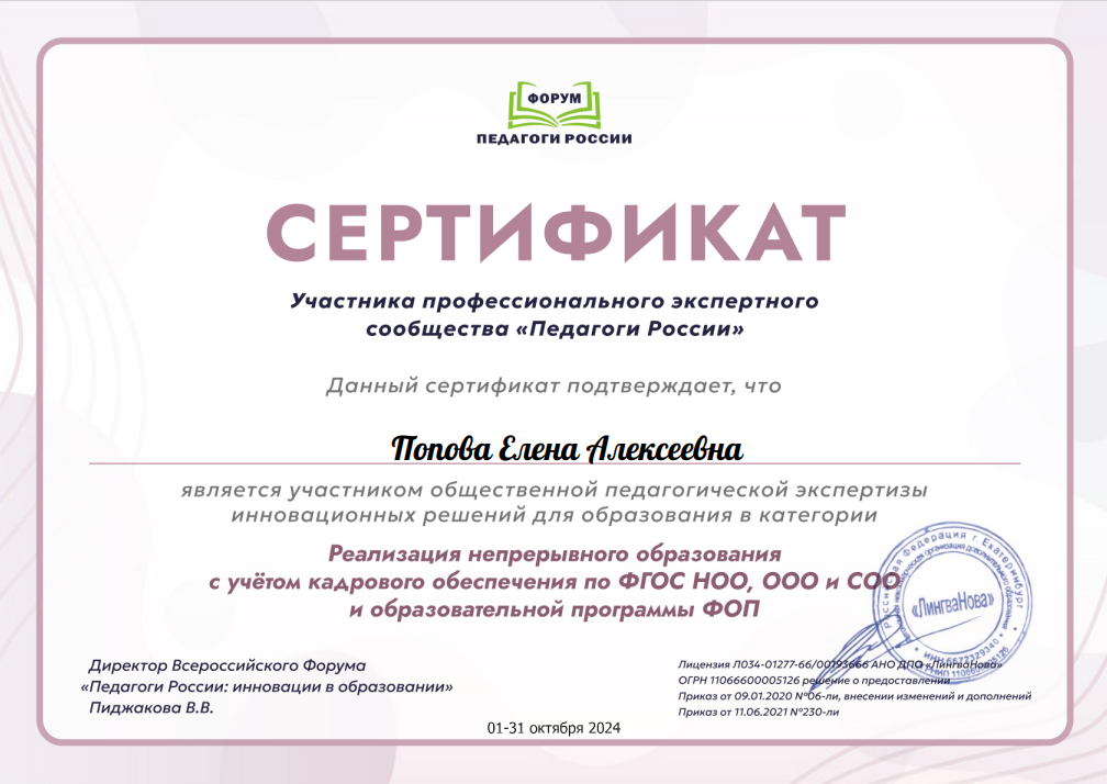 Всероссийский форум «Педагоги России: инновации в образовании»	Сертификат участника экспертного сообщества «Педагоги России» в категории «Реализация непрерывного образования с учетом кадрового обеспечения по ФГОС НОО, ООО и СОО и образовательной программы ФОП»