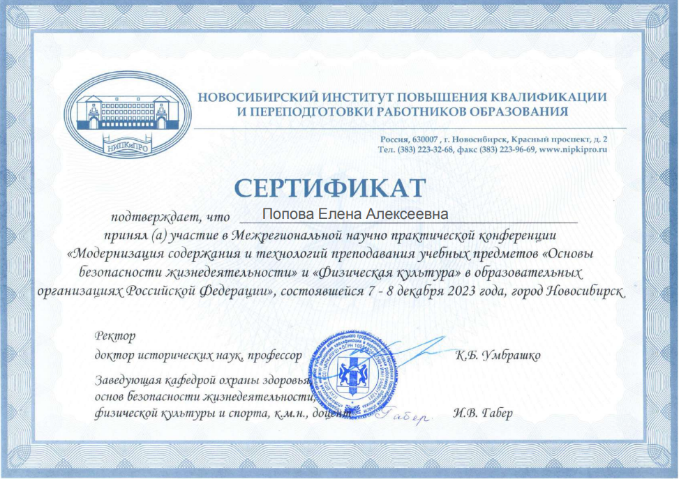НИПКиПРО	Сертификат участника международной научно-практической конференции «Модернизация содержания и технологий преподавания учебных предметов «Основы безопасности жизнедеятельности» и «Физическая культура» в образовательных организациях Российской Федерации»