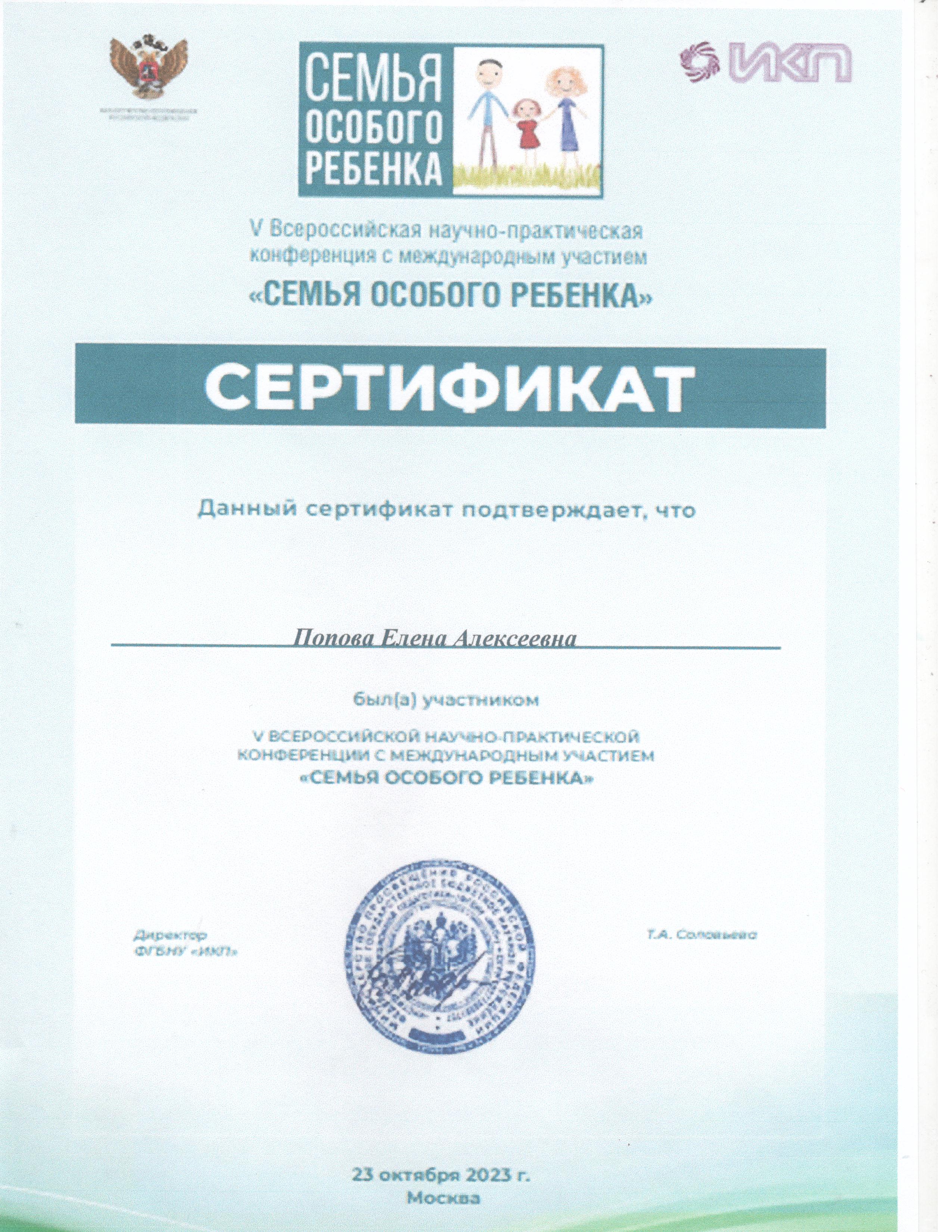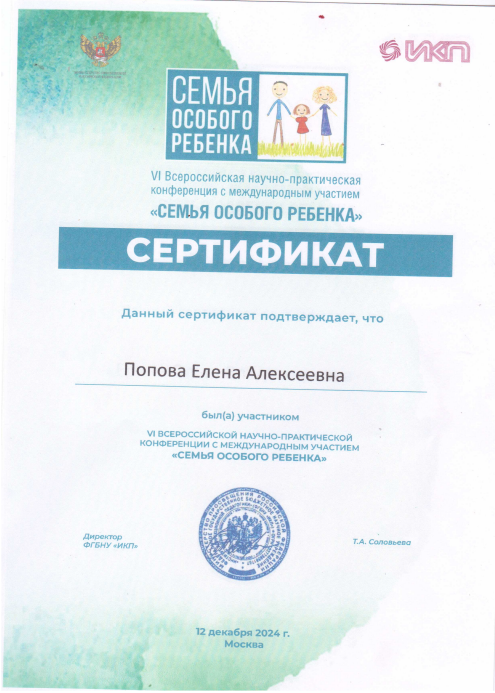 ФГБНУ «ИКП»	Сертификат участника V Всероссийской  научно-практической конференции с международным участием «Семья особого ребенка»