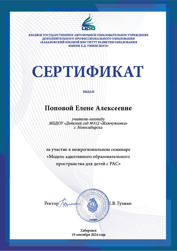Хабаровский краевой институт развития образования им. К. Д. Ушинского	Сертификат участника в межрегиональном семинаре «Модель адаптивного образовательного пространства для детей с РАС»