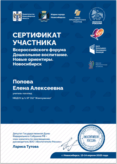 Воспитатели России	Сертификат участника Всероссийского форума Дошкольное воспитание. Новые ориентиры. Новосибирск
