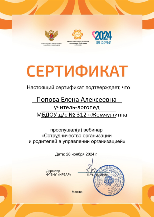 Сертификат участника вебинара «Сотрудничество организации и родителей в управлении организацией»