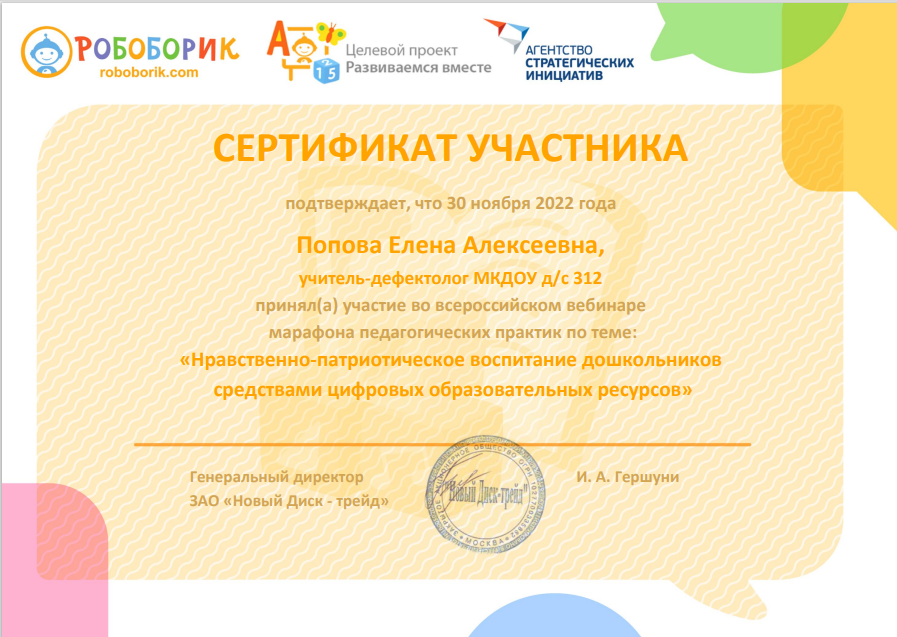ЗАО «Новый диск -  трейд» Робоборик	Сертификат участника марафона педагогических практик по теме: «Нравственно-патриотическое воспитание дошкольников средствами цифровых образовательных ресурсов»