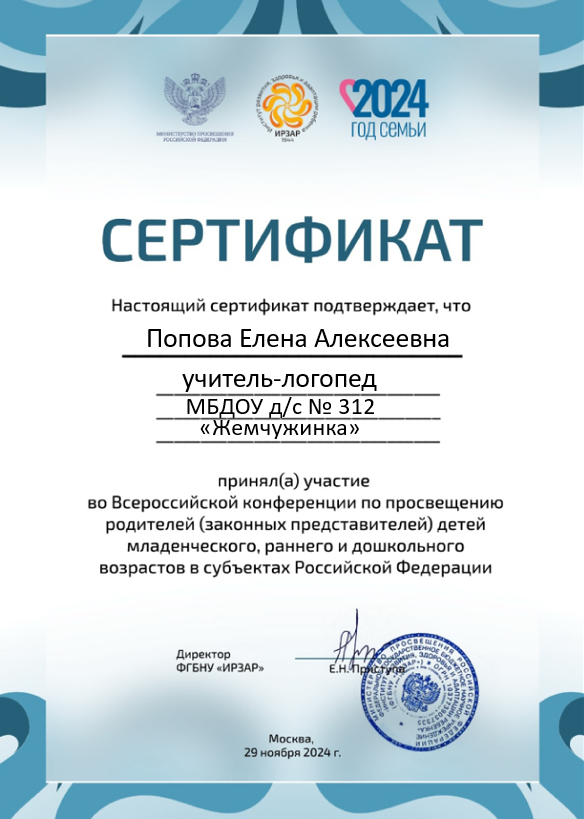 Сертификат участника Всероссийской конференции по просвещению родителей (законных представителей) детей младенческого, раннего и дошкольного возрастов в субъектах Российской Федерации