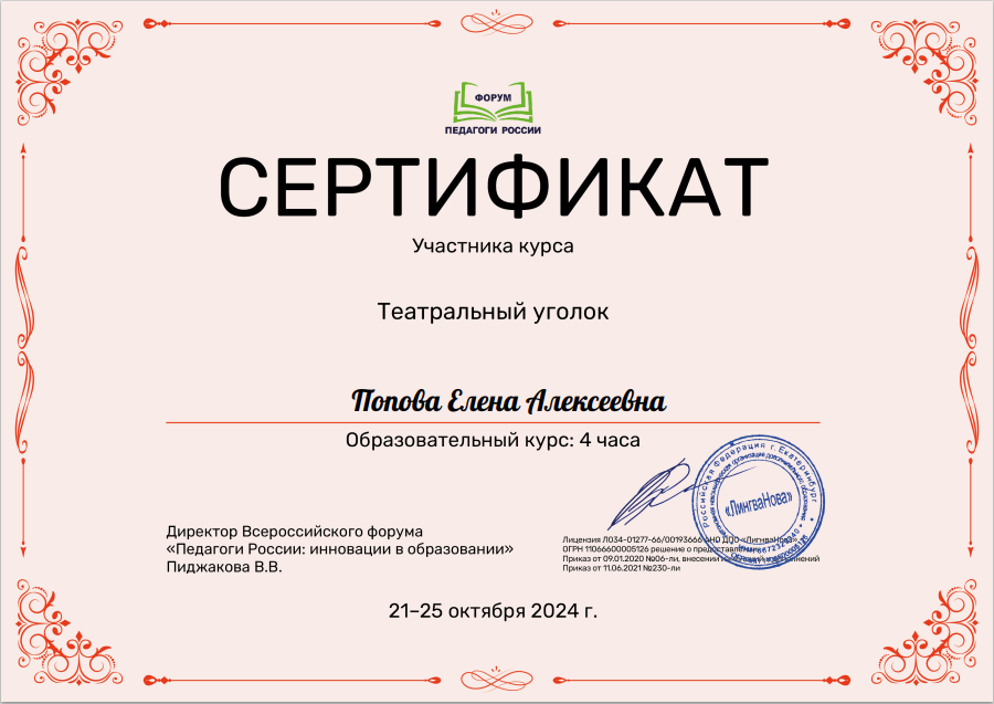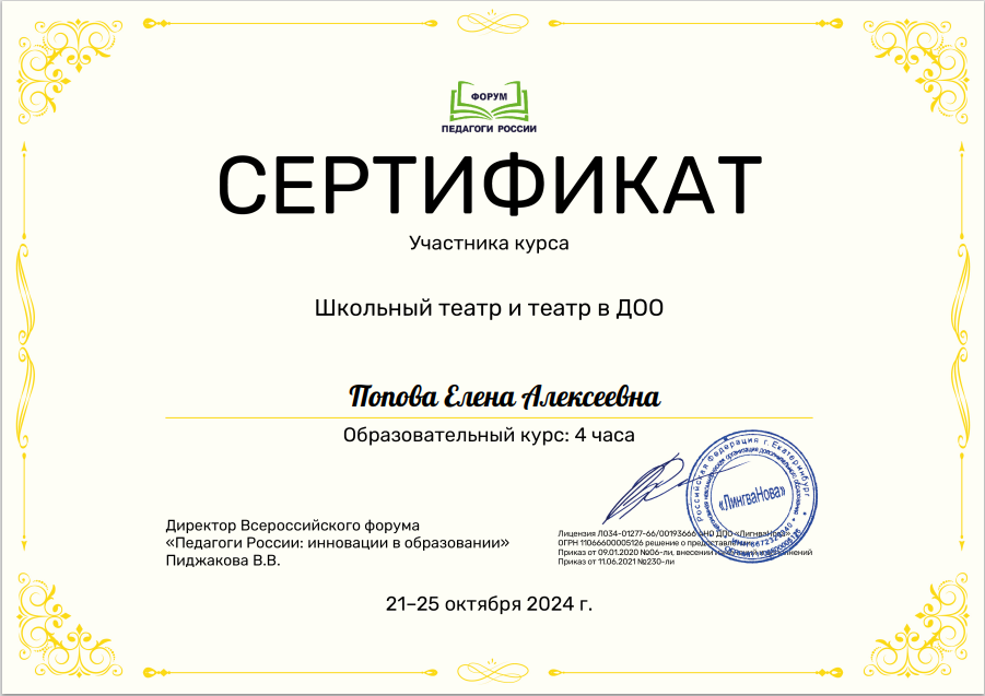 (4 часа)		Сертификат участника курса «Школьный театр и театр в ДОО»