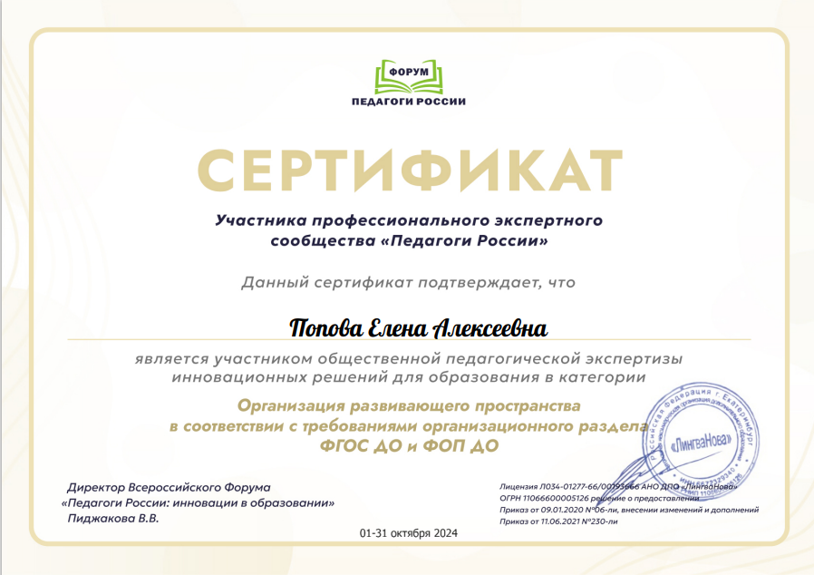 Всероссийский форум «Педагоги России: инновации в образовании»	Сертификат участника экспертного сообщества «Педагоги России» в категории «Организация развивающего пространства в соответствии с требованиями организационного раздела ФГОС ДО и ФОП ДО»