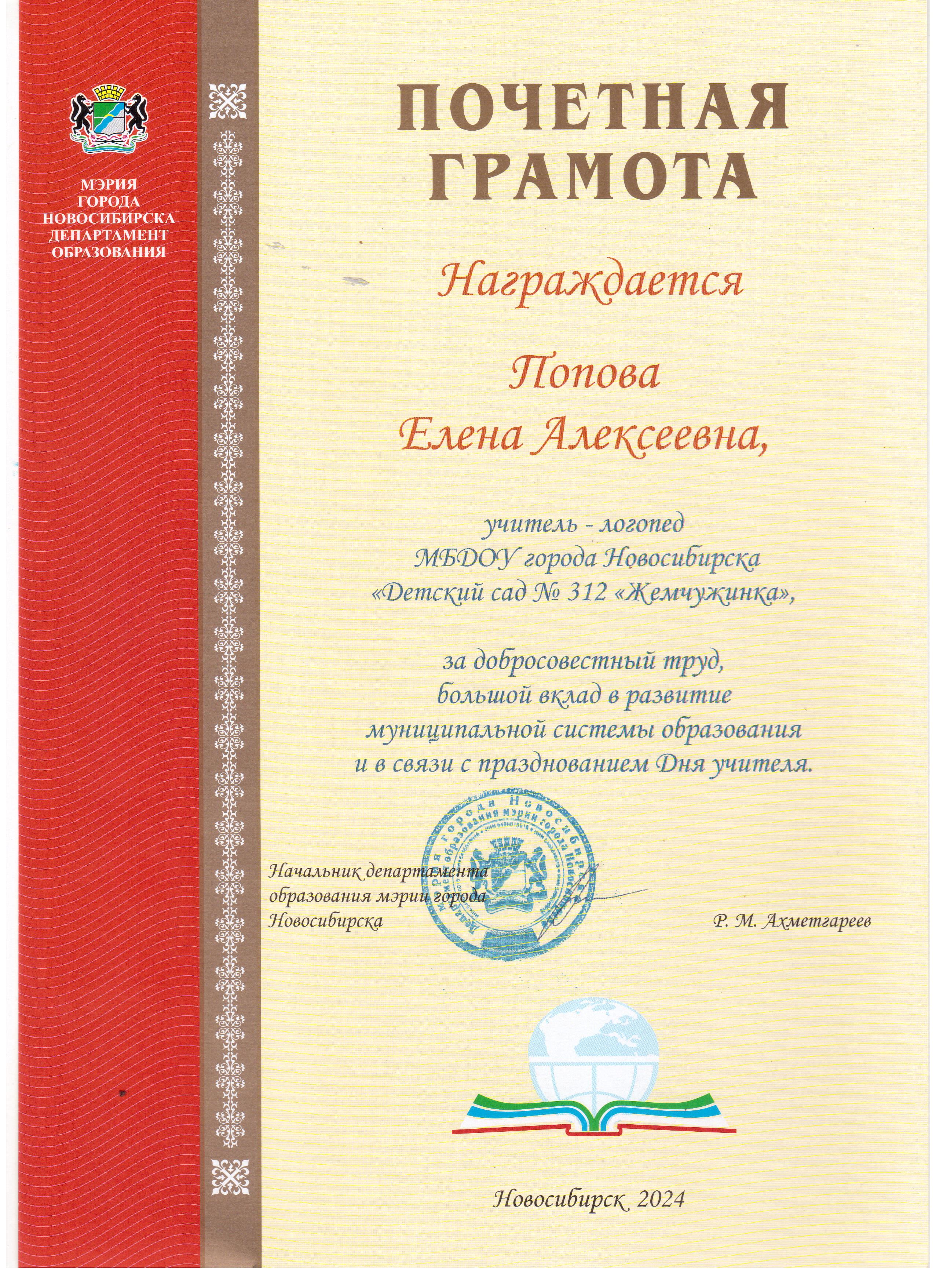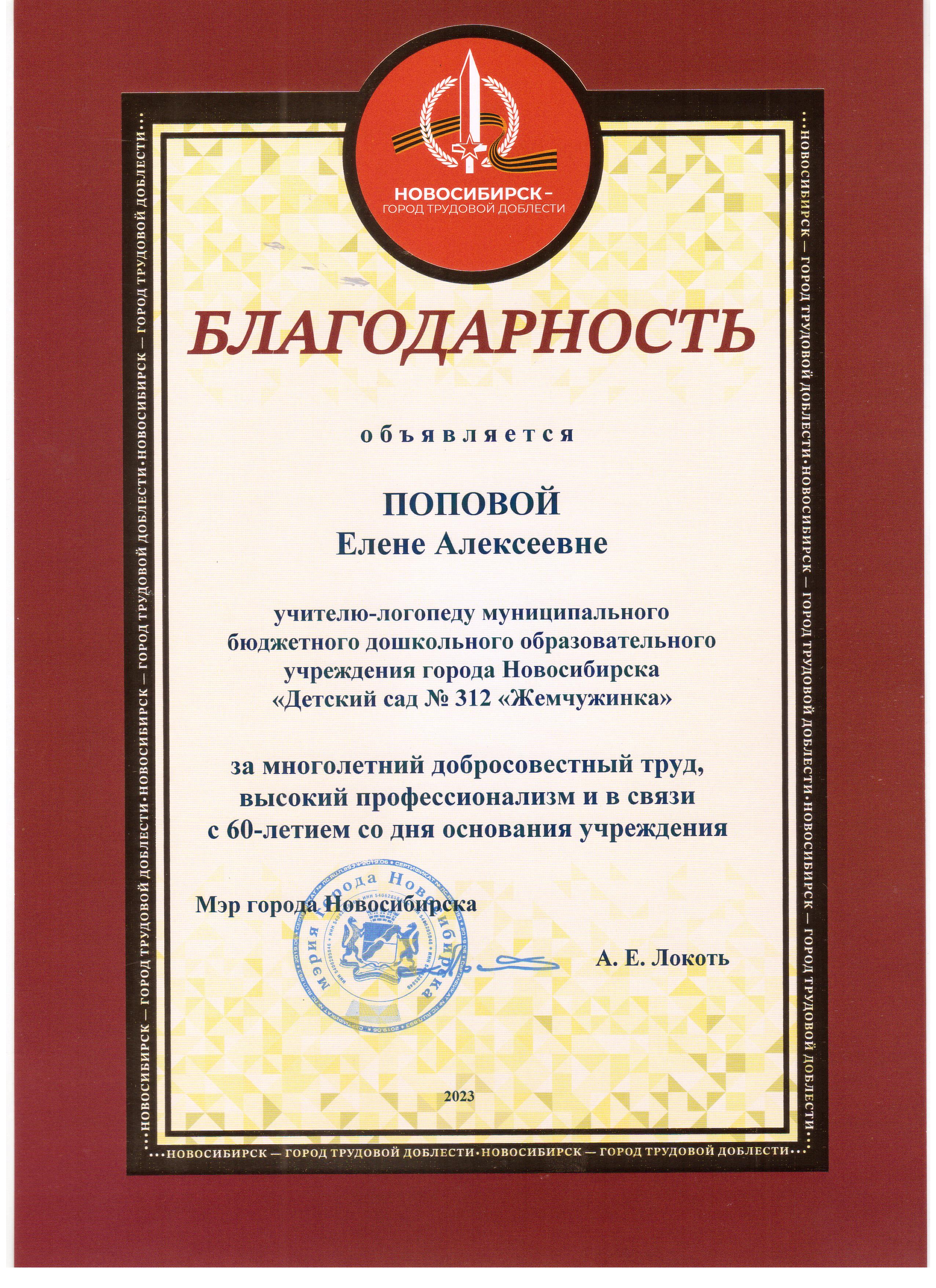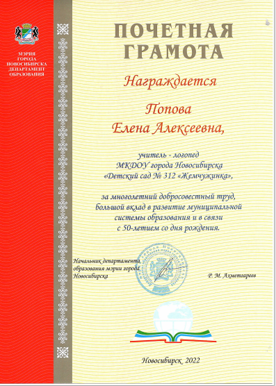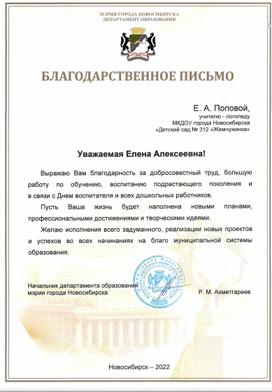 г. Новосибирска	Благодарственное письмо Департамент образования мэрия г. Новосибирска