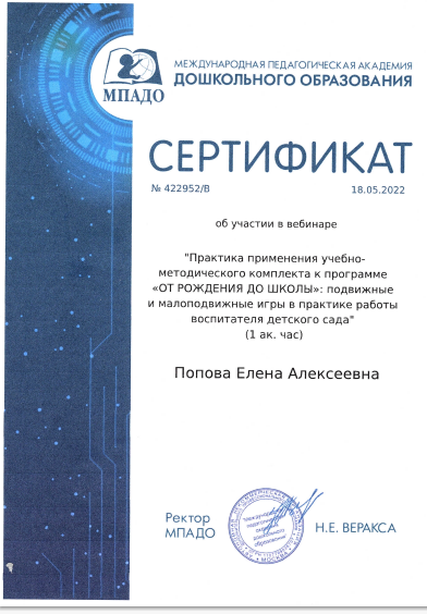 МПАДО (1 час)	Сертификат участника вебинара «Практика применения учебно-методического комплекта к программе «От рождения до школы»