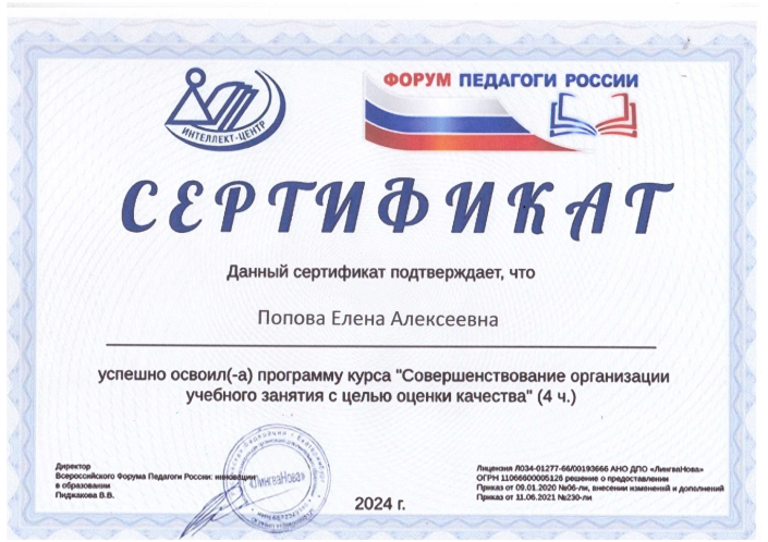 (4 часа)	Сертификат участника обучающего курса  «Совершенствование организации учебного занятия с целью оценки качества»
