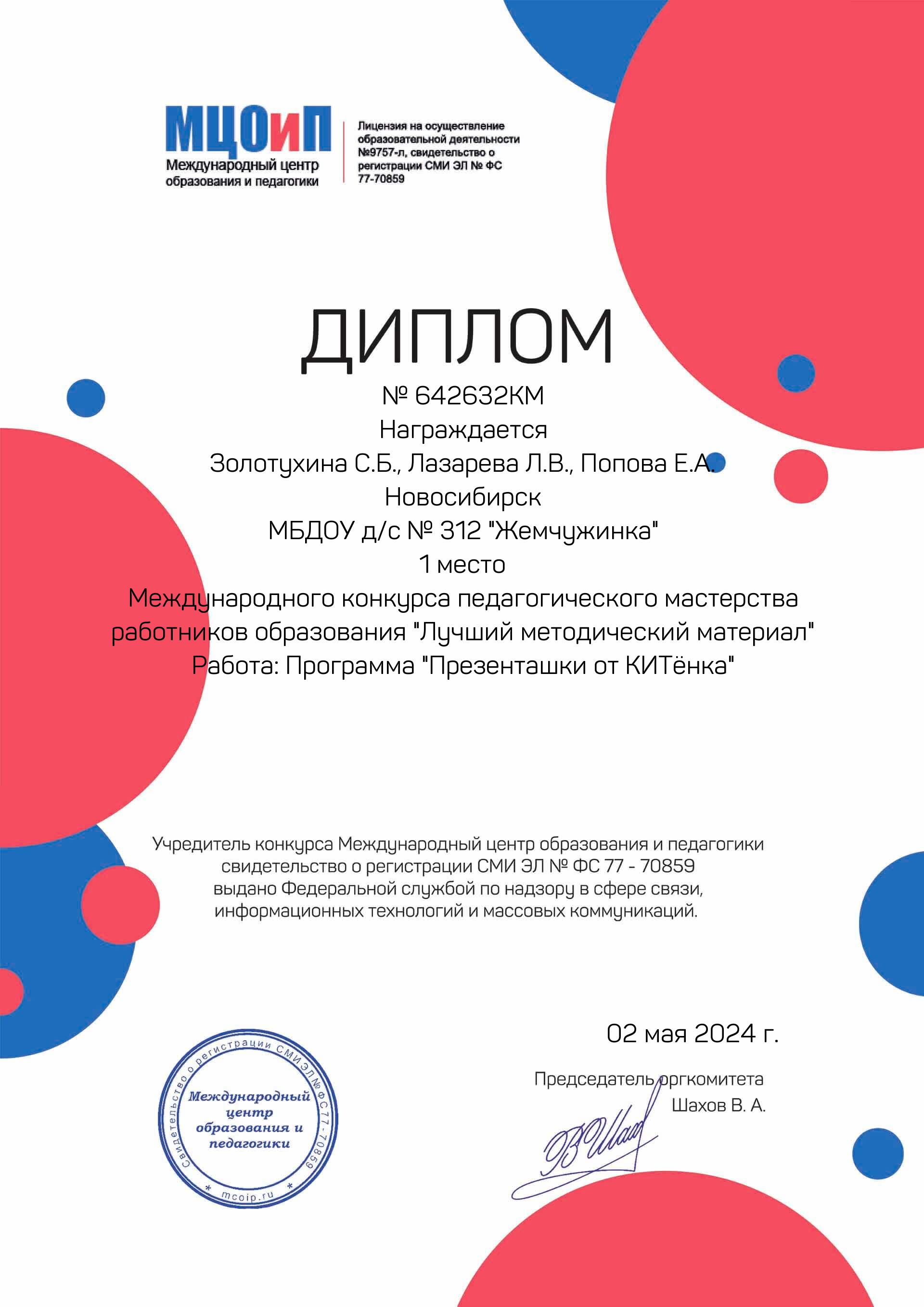 МЦОиП	Диплом (I место) международного конкурса педагогического мастерства работников образования «Лучший методический материал»