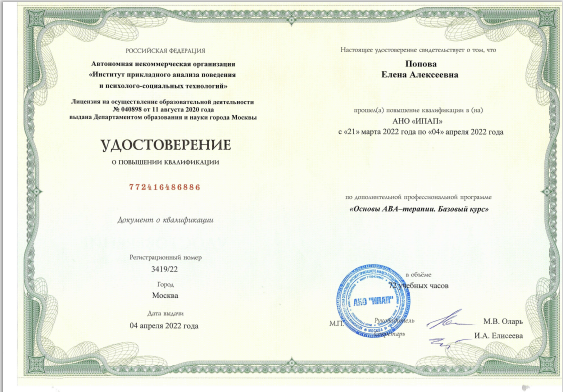(72 часа)	Удостоверение о повышении квалификации по адаптивной профессиональной программе «АВА-терапия». «Основы АВА-терапии. Базовый курс»