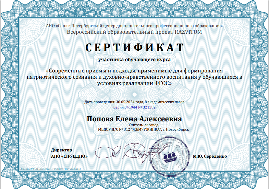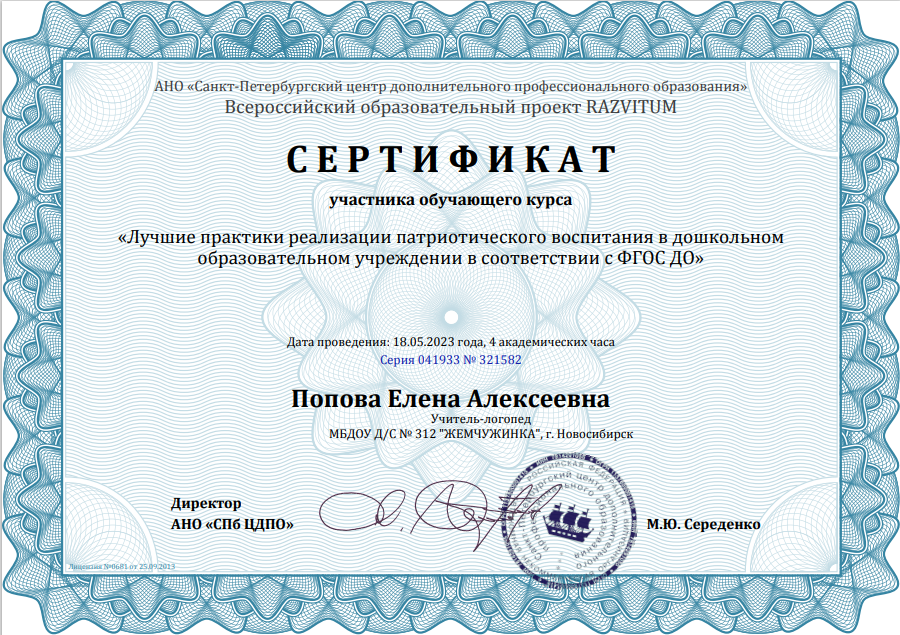 (4 часа)	Сертификат участника обучающего курса  Лучшие практики реализации патриотического воспитания в дошкольном образовательном учреждении в соответствии с ФГОС ДО»