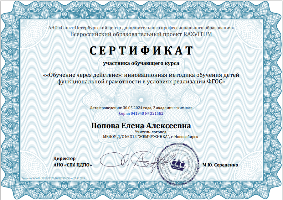 (2 часа)	Сертификат участника обучающего курса «Обучение через действие»: инновационная методика обучения детей функциональной грамотности в условиях реализации ФГОС»