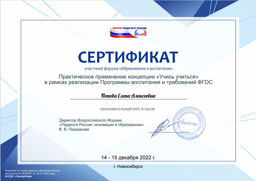 Всероссийский форум «Педагоги России: инновации в образовании» 	Сертификат участника форума Педагоги России «Образование и воспитание» «Практическое применение концепции «учись учиться» в рамках Программы воспитания и требований ФГОС