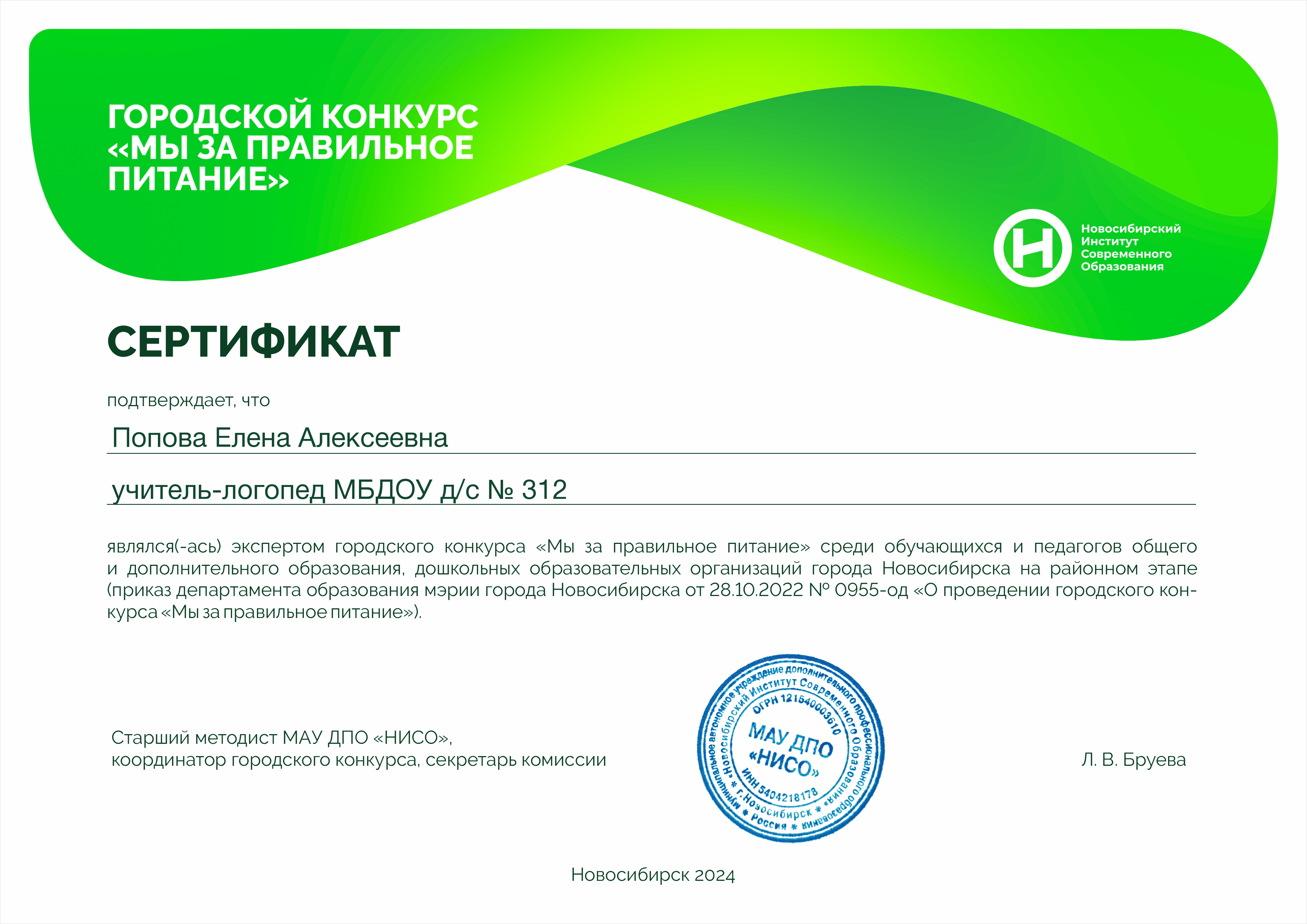 МАУ ДПО «НИСО»	Сертификат эксперта городского конкурса «Мы - за правильное питание»