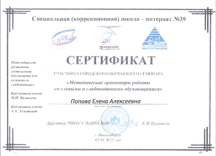 Специальная (коррекционная) школа-интернат № 39	Сертификат участника городского обучающего семинара «Методические ориентиры работы со слепыми и слабовидящими обучающимися»