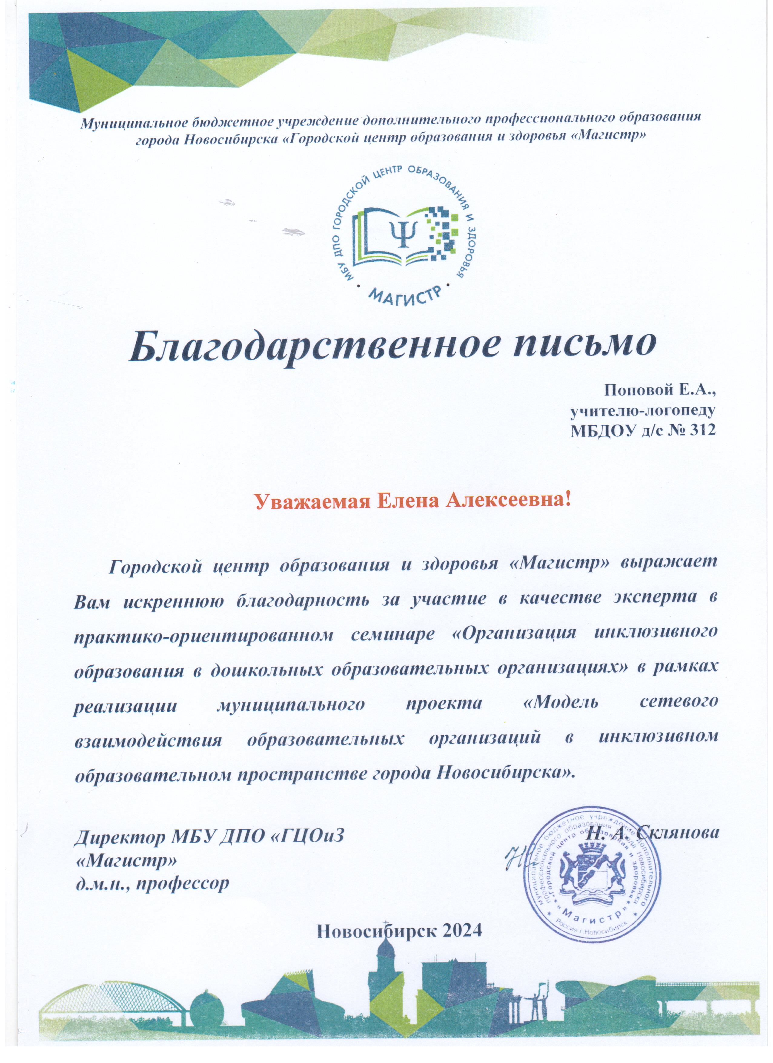 24.11.2024г. МБУ ДПО «ГЦОиЗ «Магистр»	Благодарственное письмо за участие в качестве эксперта в практико-ориентированном семинаре «Организация инклюзивного образования в дошкольных образовательных организациях»