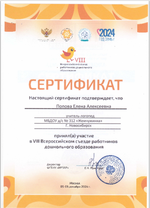 Сертификат участника VIII Всероссийского съезда работников дошкольного образования