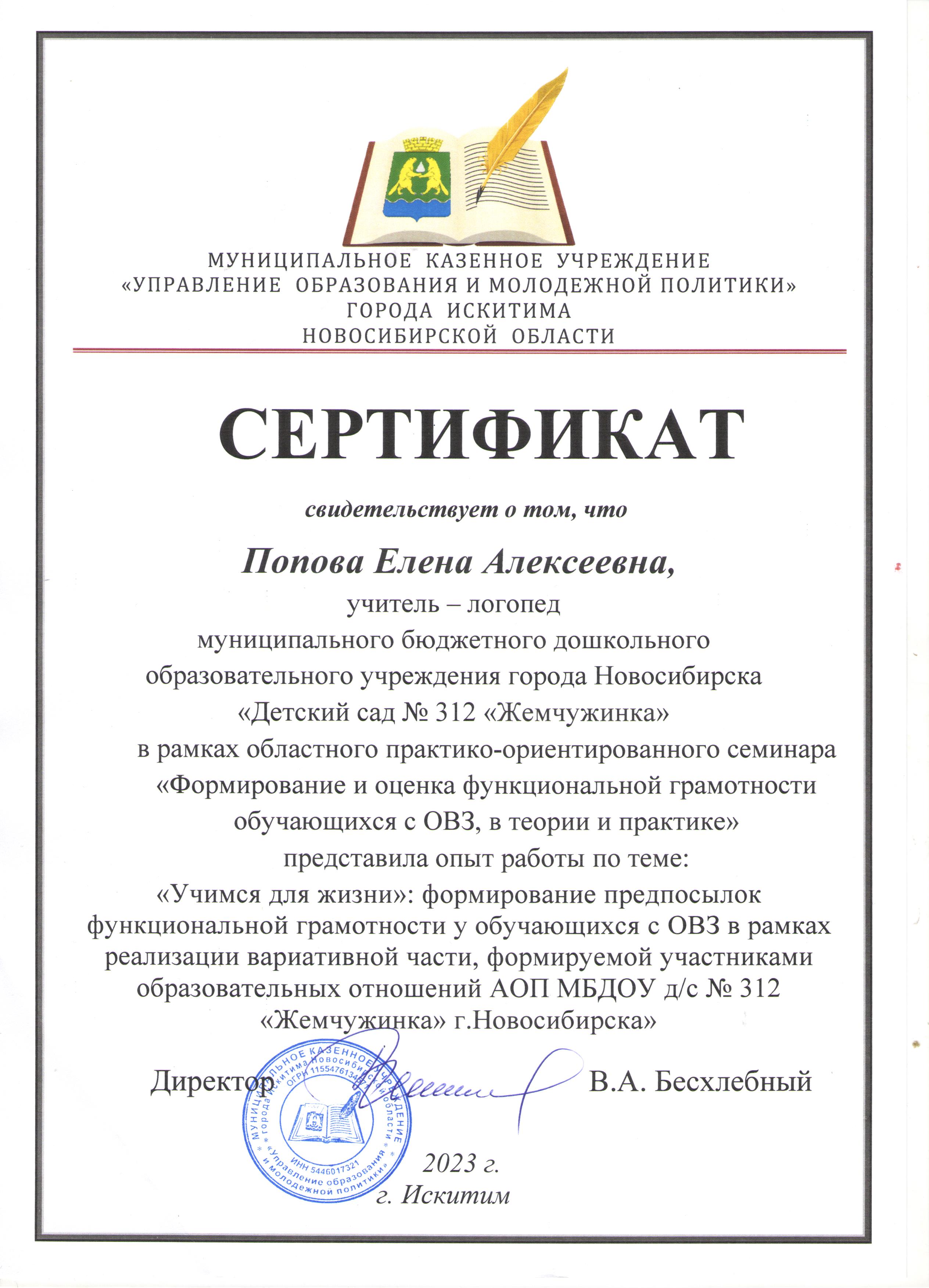 Практико-ориентированный семинар «Формирование и оценка функциональной грамотности обучающихся с ОВЗ, в теории и практике»	Сертификат трансляции опыта по теме: «Учимся для жизни»