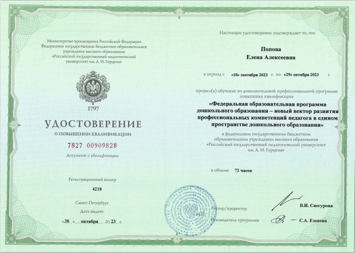 (72 часа)	Удостоверение о повышении квалификации по дополнительной профессиональной программе «ФОП ДО - новый вектор развития профессиональных компетенций педагога в едином пространстве дошкольного образования»