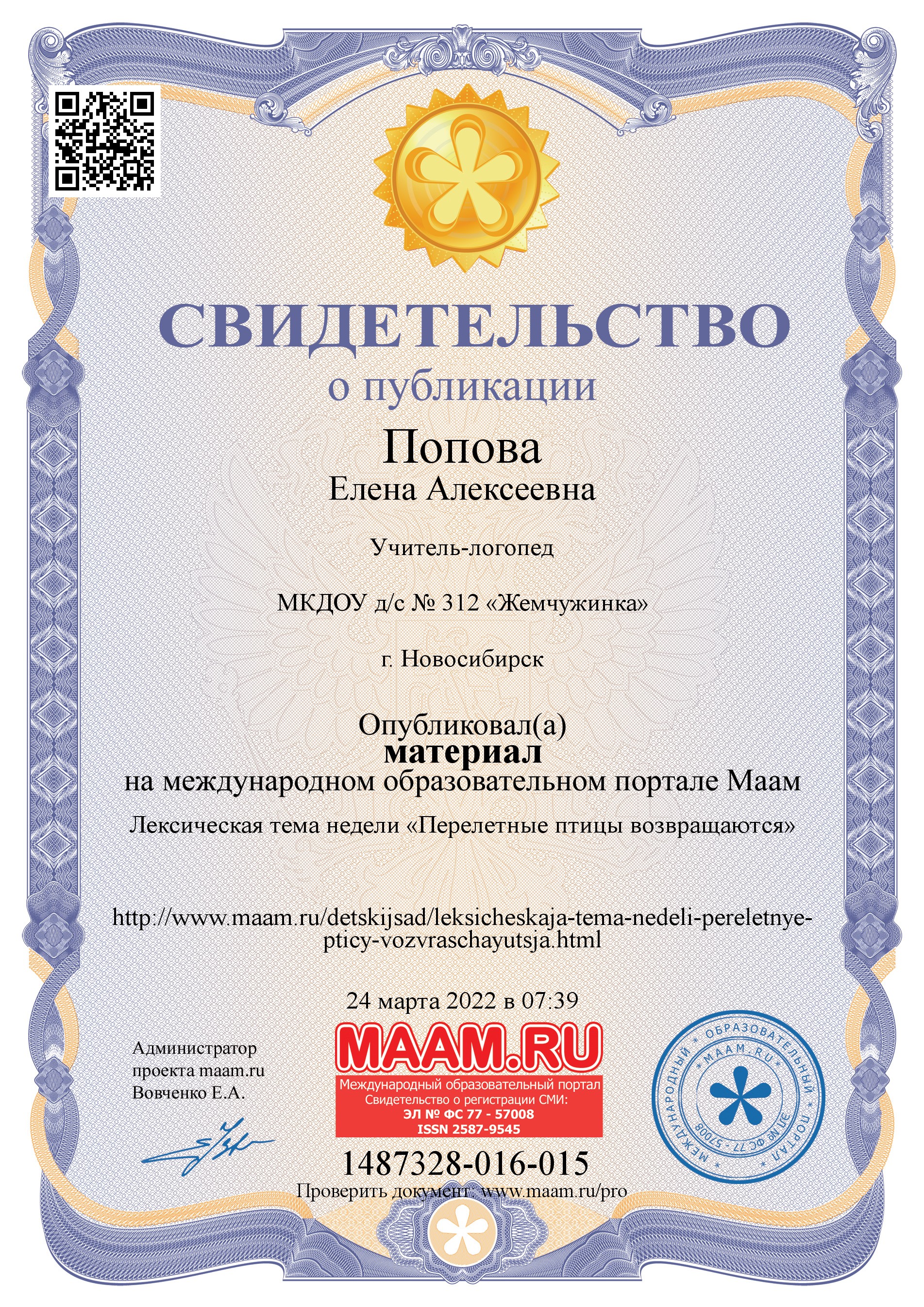 Международный образовательный портал «МААМ.ru»	Свидетельство о публикации по теме: «Лексическая тема недели «Перелетные птицы возвращаются»