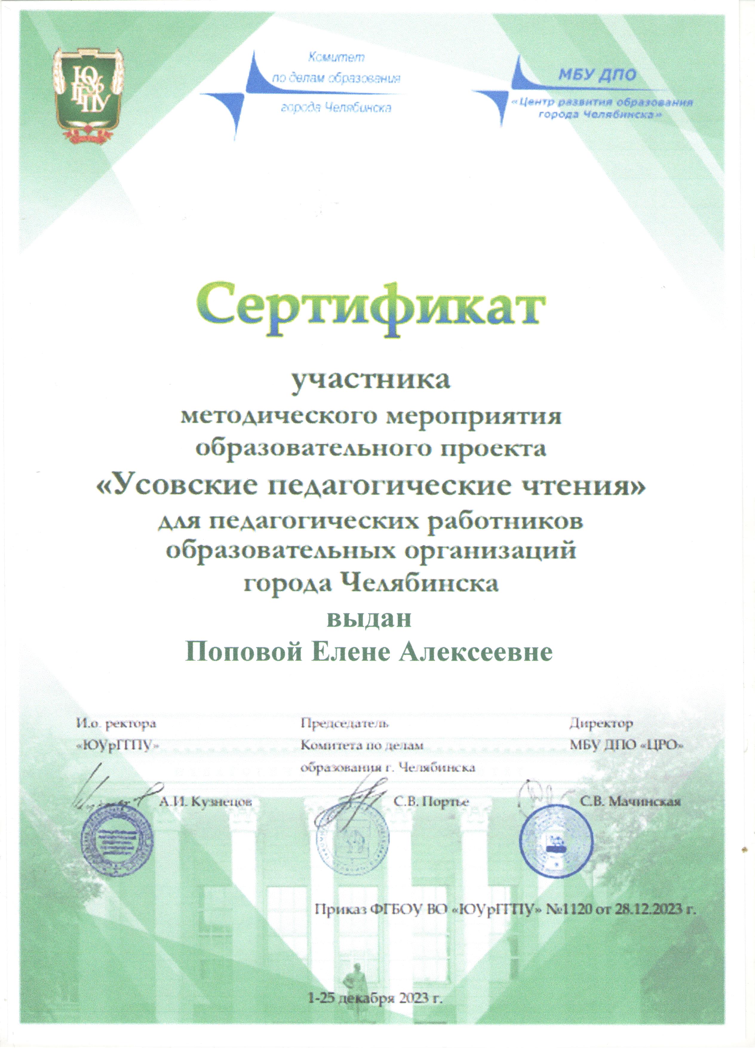 МБУ ДПО «Центр развития образования города Челябинска»	Сертификат участника методического мероприятия образовательного проекта «Усовские педагогические чтения» г. Челябинск
