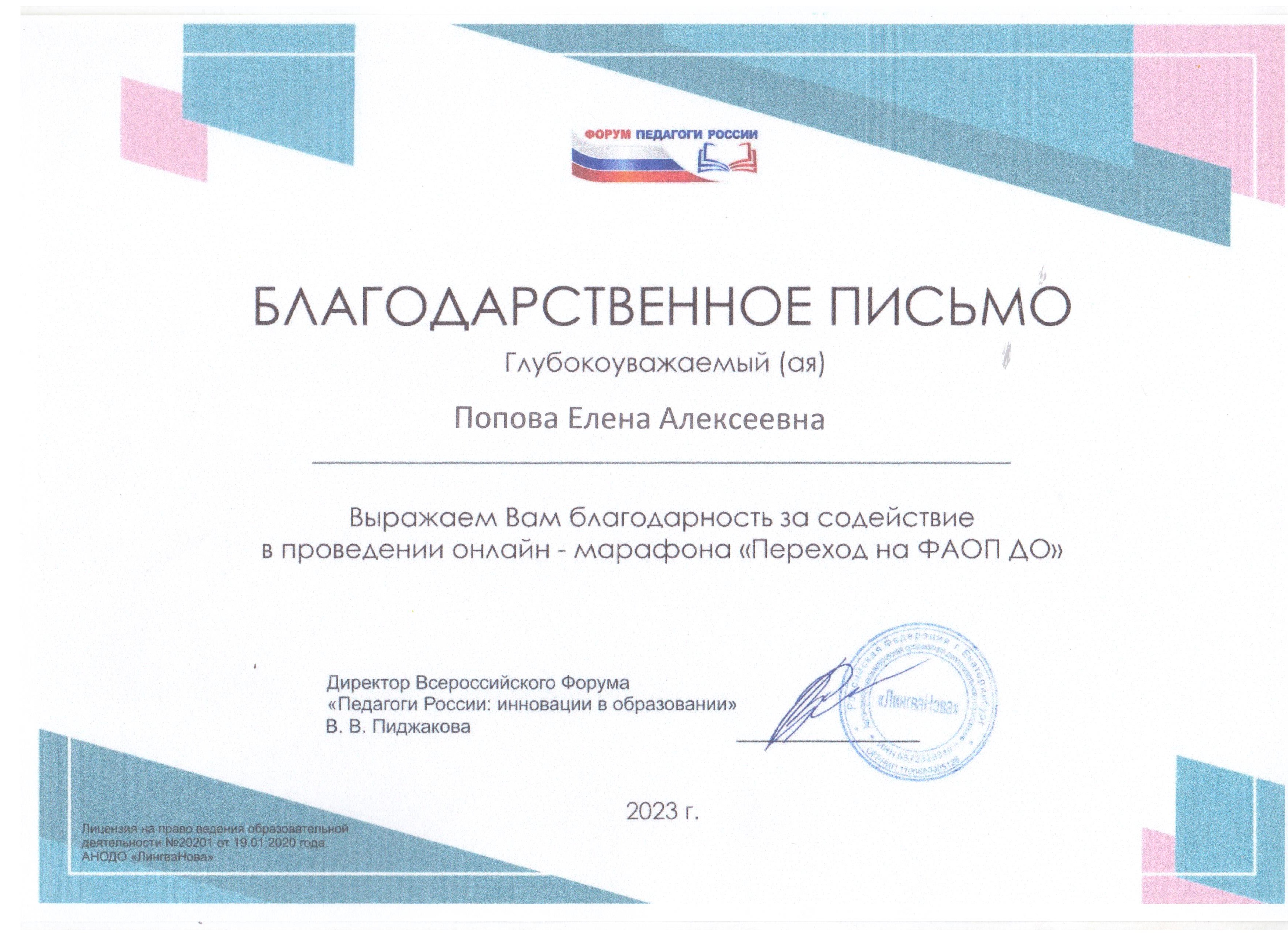 Благодарственное письмо за содействие в проведении онлайн-марафона «Переход на ФАОП ДО»