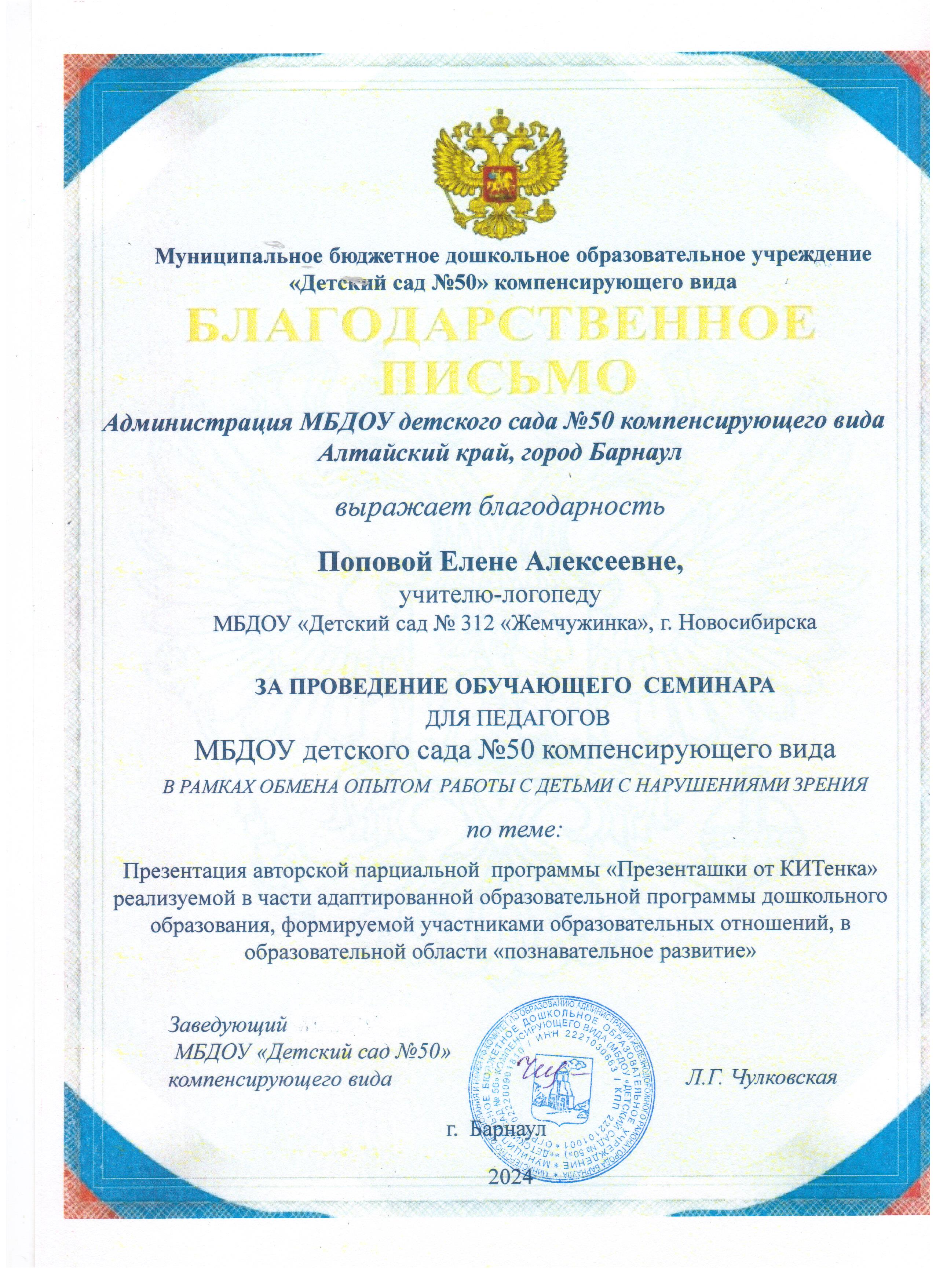 МБДОУ «Детский сад № 50» г. Барнаул	Благодарственное письмо  за проведение обучающего семинара для педагогов по теме: «Презентация авторской парциальной программы «Презенташки от КИТенка»