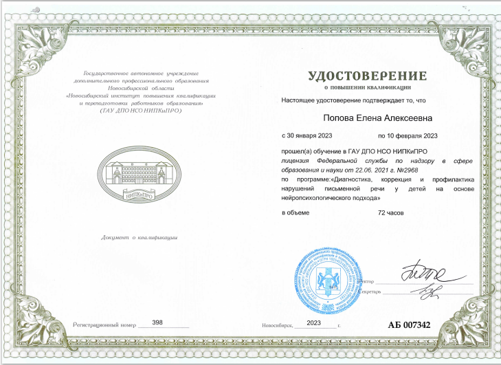 НИПКиПРО	Удостоверение  о повышении квалификации по программе «Диагностика, коррекция и профилактика нарушений письменной речи у детей на основе нейропсихологического подхода»