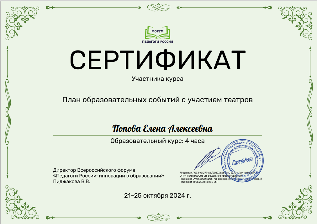 (4 часа)		Сертификат участника курса «План образовательных событий с участием  театров»