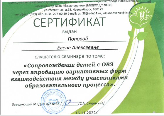 МКДОУ д/с  № 38 «Вдохновение» 15 ноября 2022г	Сертификат участника семинара «Сопровождение детей с ОВЗ через апробацию вариативных форм взаимодействия между участниками образовательного процесса»