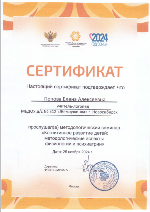 Сертификат участника семинара «Когнитивное развитие детей: методологические аспекты физиологии и психиатрии»