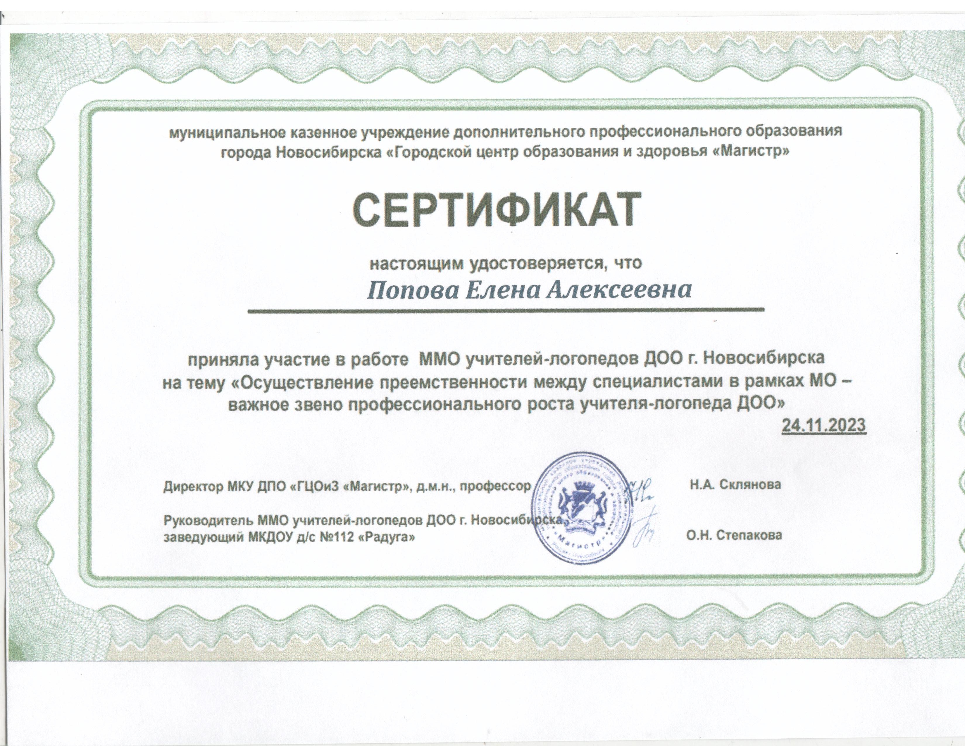 МКУДПО «Магистр»	Сертификат участника ММО учителей-логопедов ДОО г. Новосибирска на тему: «Осуществление преемственности между специалистами в рамках МО - важное звено профессионального роста учителя-логопеда ДО»