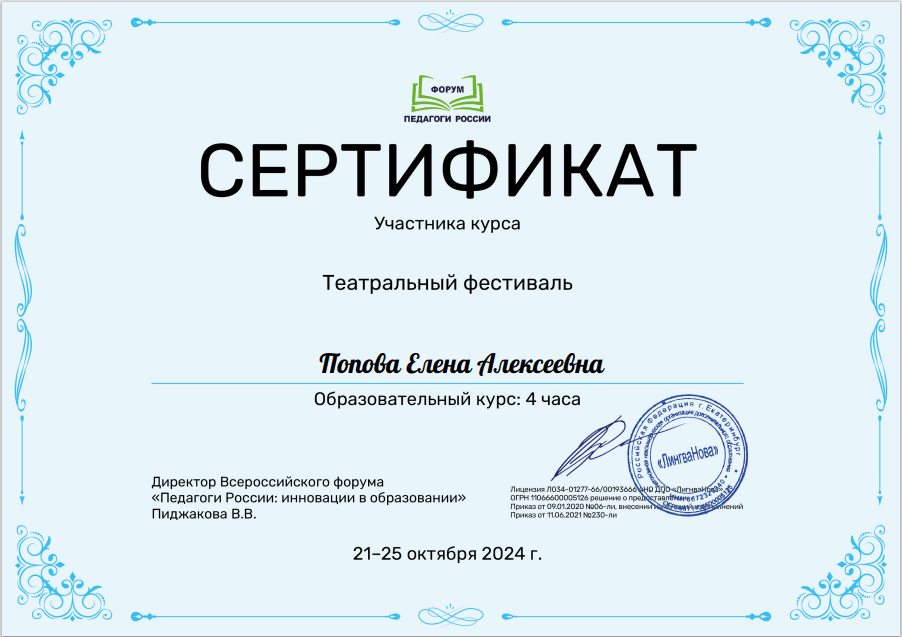 (4 часа)		Сертификат участника курса «Театральный фестиваль»